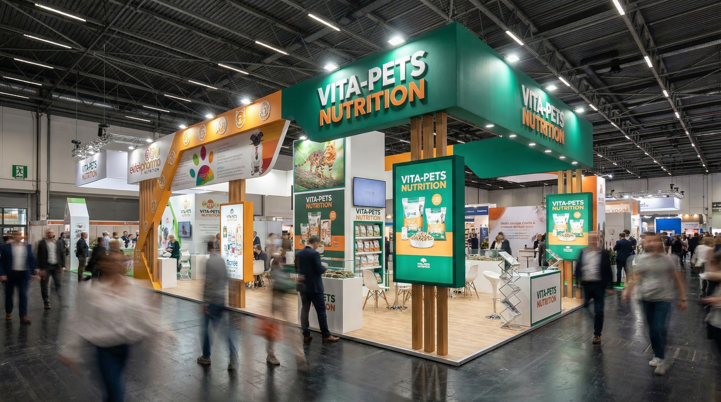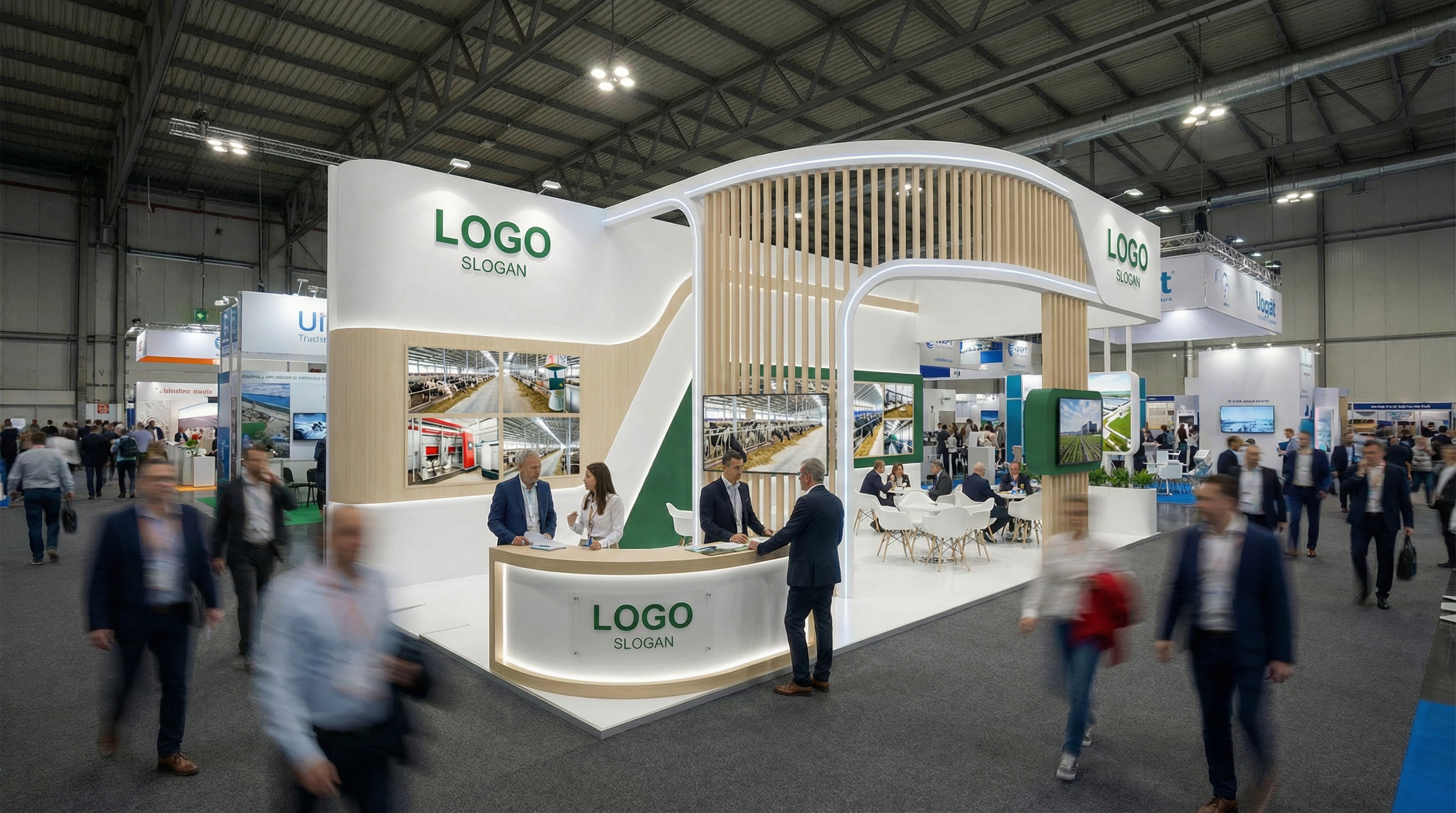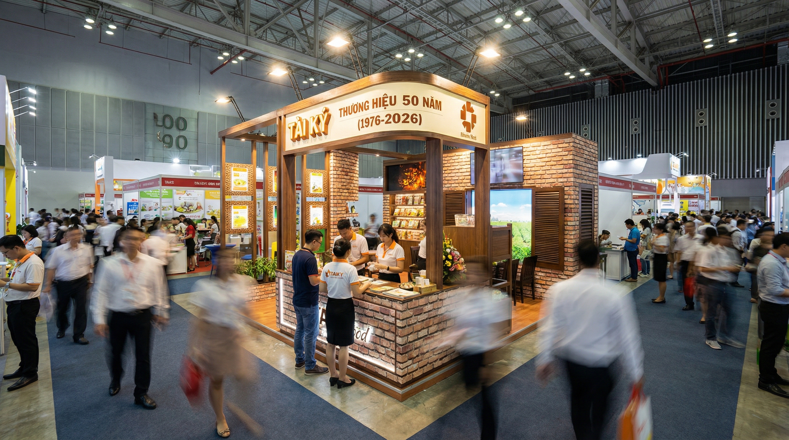 Từ xa, khách thường chỉ kịp nhìn logo, màu sắc và một câu thông điệp. Vì vậy, một gian hàng tốt cần: